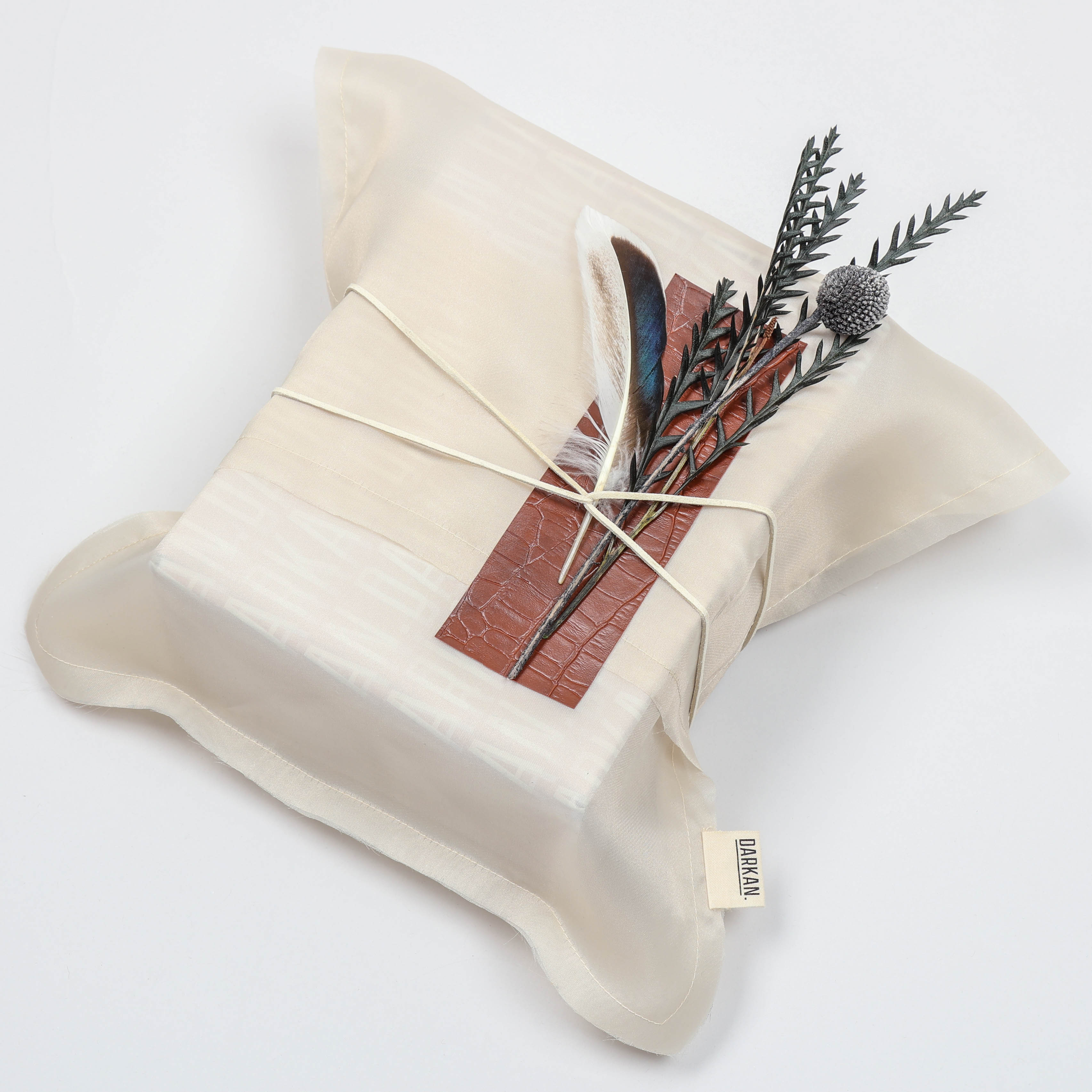 Delicately wrapped with a velvet rope, embellished with a pitch of dry flower, leather & natural feather.