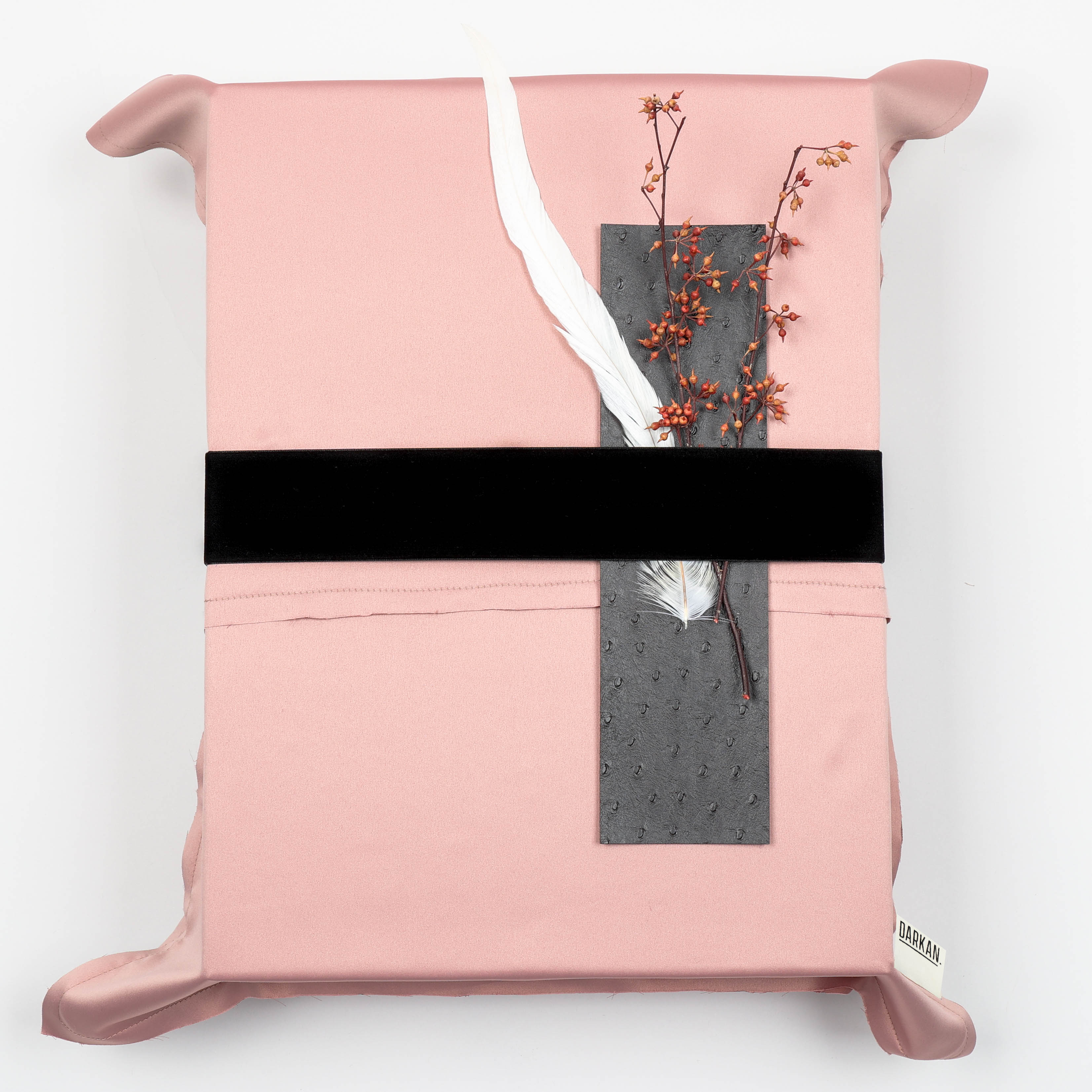 Delicately wrapped with a velvet rope, embellished with a pitch of dry flower, leather & natural feather.